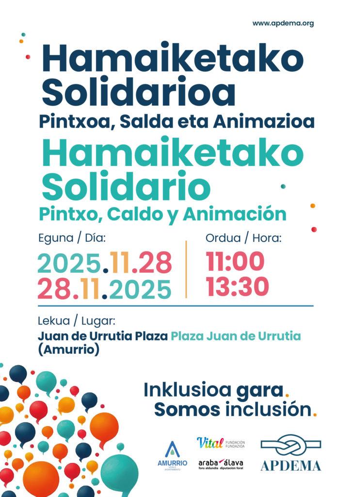Hoy, viernes 28 de noviembre, la Plaza Juan de Urrutia de Amurrio se ha convertido en un espacio de encuentro, solidaridad e inclusión gracias a la celebración del Hamaiketako Solidario de Apdema. Durante toda la mañana, entre las 11:00 y las 13:30 horas, vecinos y vecinas de la localidad, junto con familias, personas usuarias, profesionales, voluntariado de la asociación y representantes sociales, han compartido un ambiente festivo marcado por la animación y el sabor del pintxo-caldo solidario.
